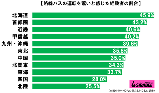 結果、「路線バスの運転が荒いと思ったことがある」と答えた人は39.5%。半数は下回ったが、少々多い結果のようにも思える。