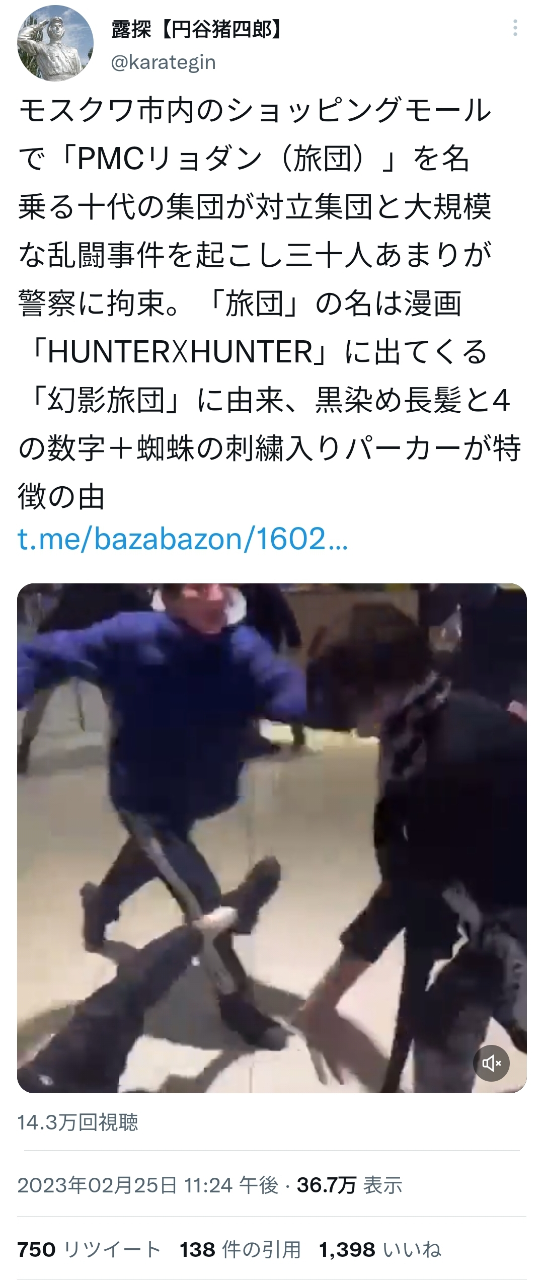 【画像】ロシアに幻影旅団出現、蜘蛛の刺繍が入ったパーカーを着た若者集団がモールで大乱闘www