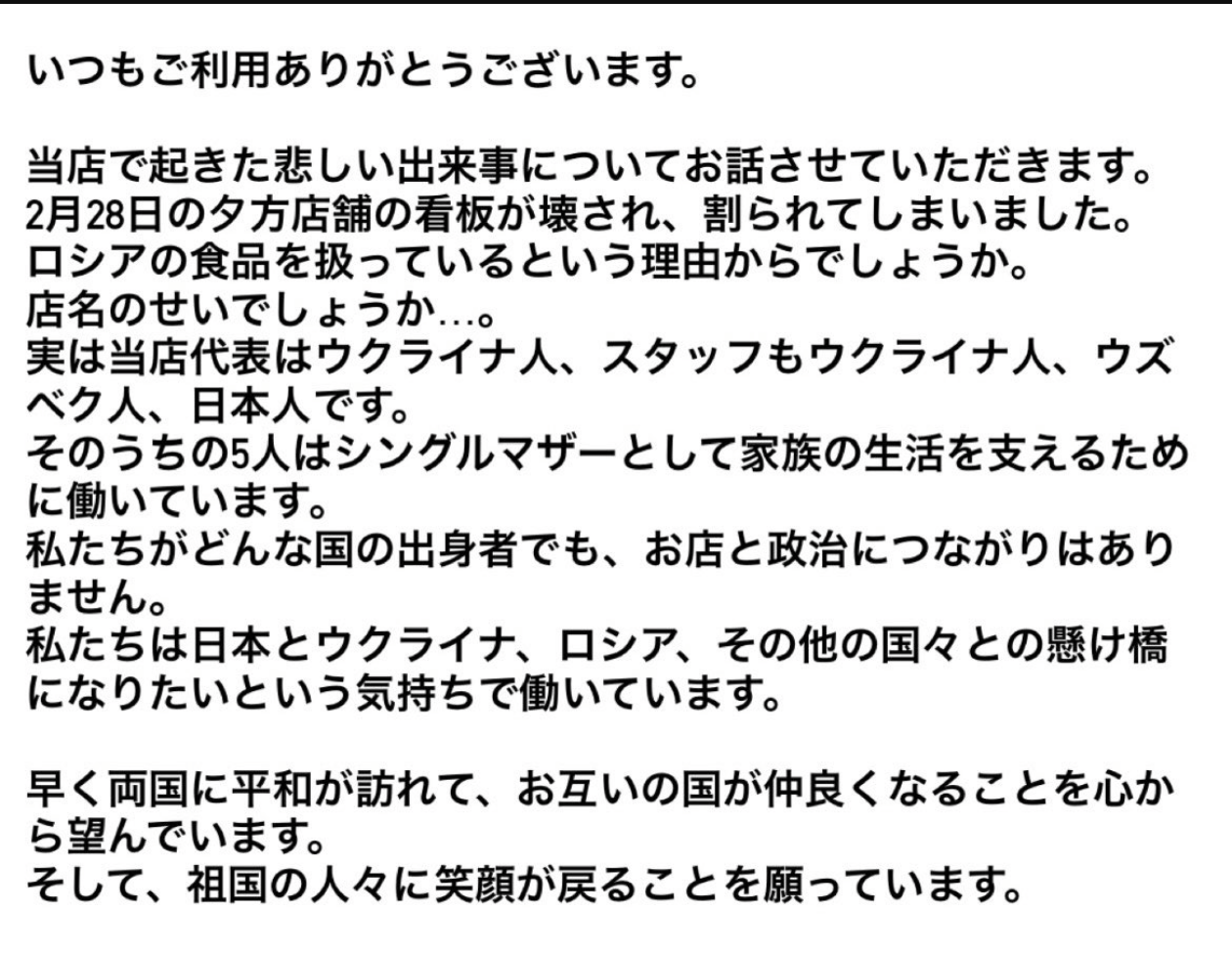 ロシア食品専門店「看板が壊されました。。。ウクライナ人とウズベク人と日本人で営んでるお店なのに一体なぜ。。。」