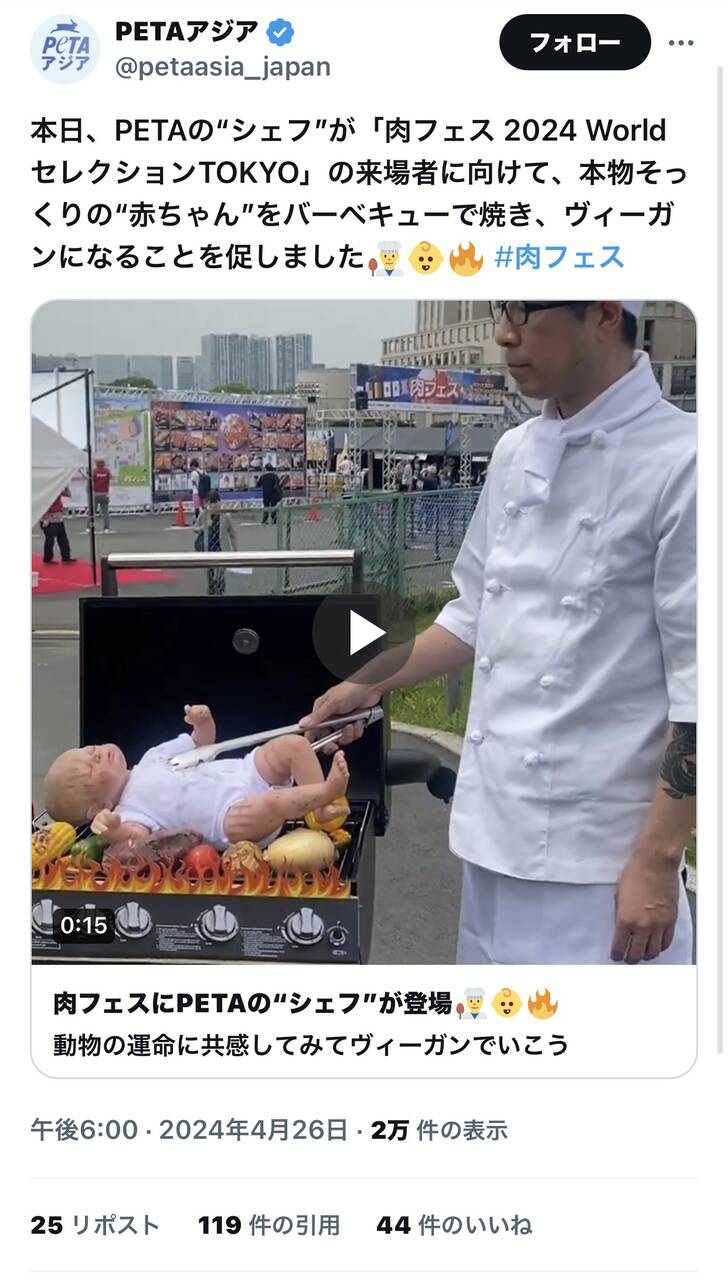 本日、PETAの“シェフ”が「肉フェス 2024 World セレクションTOKYO」の来場者に向けて、本物そっくりの“赤ちゃん”をバーベキューで焼き、ヴィーガンになることを促しました