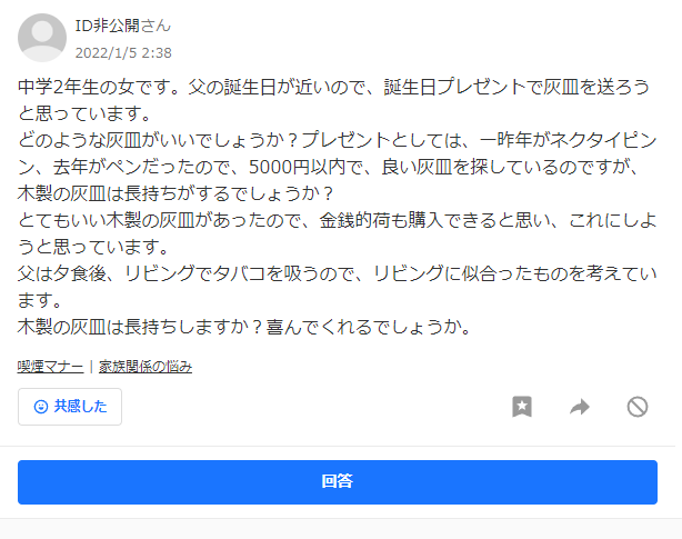 【画像】中2女子「父親の誕生日プレゼントを考えています。灰皿がいいでしょうか?」→批判相次ぐ