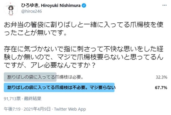 最終的に約9万1千票をあつめ、結果は67.7%もの人が「割りばしの袋に入ってる爪楊枝は不必要」を選んでいます。