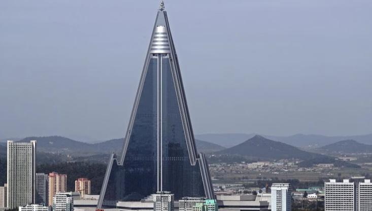 1988年にソウルで朝鮮半島初のオリンピックが開催されることが確定し、北朝鮮側も対抗するように世界青年学生祭典の誘致を決定した。その際にホテルが必要となったが、大規模な宿泊施設が平壌に無いという問題が発覚。新たに105階建て、高さ330mのピラミッド型超高層ビルの建設が決まったが祭典までの建設は不可能だという判断がされ長らく空きビルとして放置されていた。2008年から16年ぶりに建設が再開され窓ガラスが取り付けられたが、2023年現在になっても開業の情報などはない。
