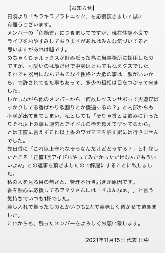 【画像】地下アイドルの解雇報告、とんでもなく雑wwwww