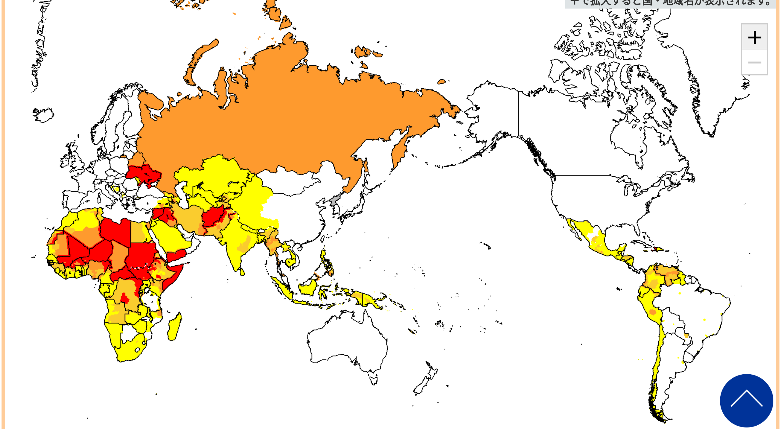 黄 →十分注意薄オレンジ→不要不急の渡航止めてオレンジ →渡航中止勧告赤 →退避勧告