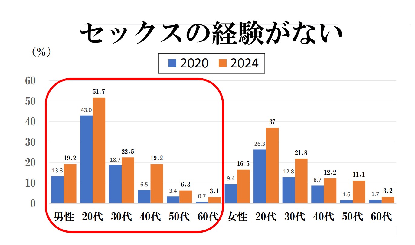 婚姻関係がありながら、性交渉が1カ月以上ないと回答した人の割合が6割を超えることが、日本人の性に関する実態調査「【ジェクス】ジャパン・セックスサーベイ2024」で分かった。若年男性が他世代より性への関心が際立って薄いことも判明。調査を行った専門家は「日本人のセックスレスが加速しており、特に若年男性は草食化を通り越し〝絶食化〟が進んでいる印象がある」と懸念を示した。
