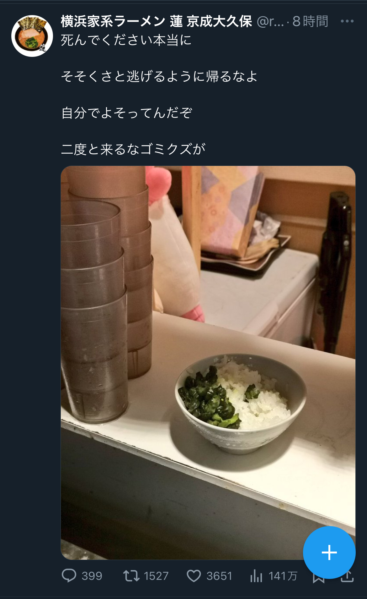 【画像】家系ラーメン屋、客に対して「死んでください。」 大炎上ww