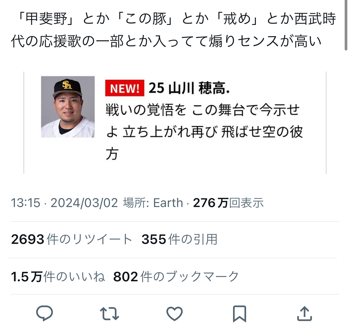 【画像】山川穂高の応援歌、歌詞変更されるwww