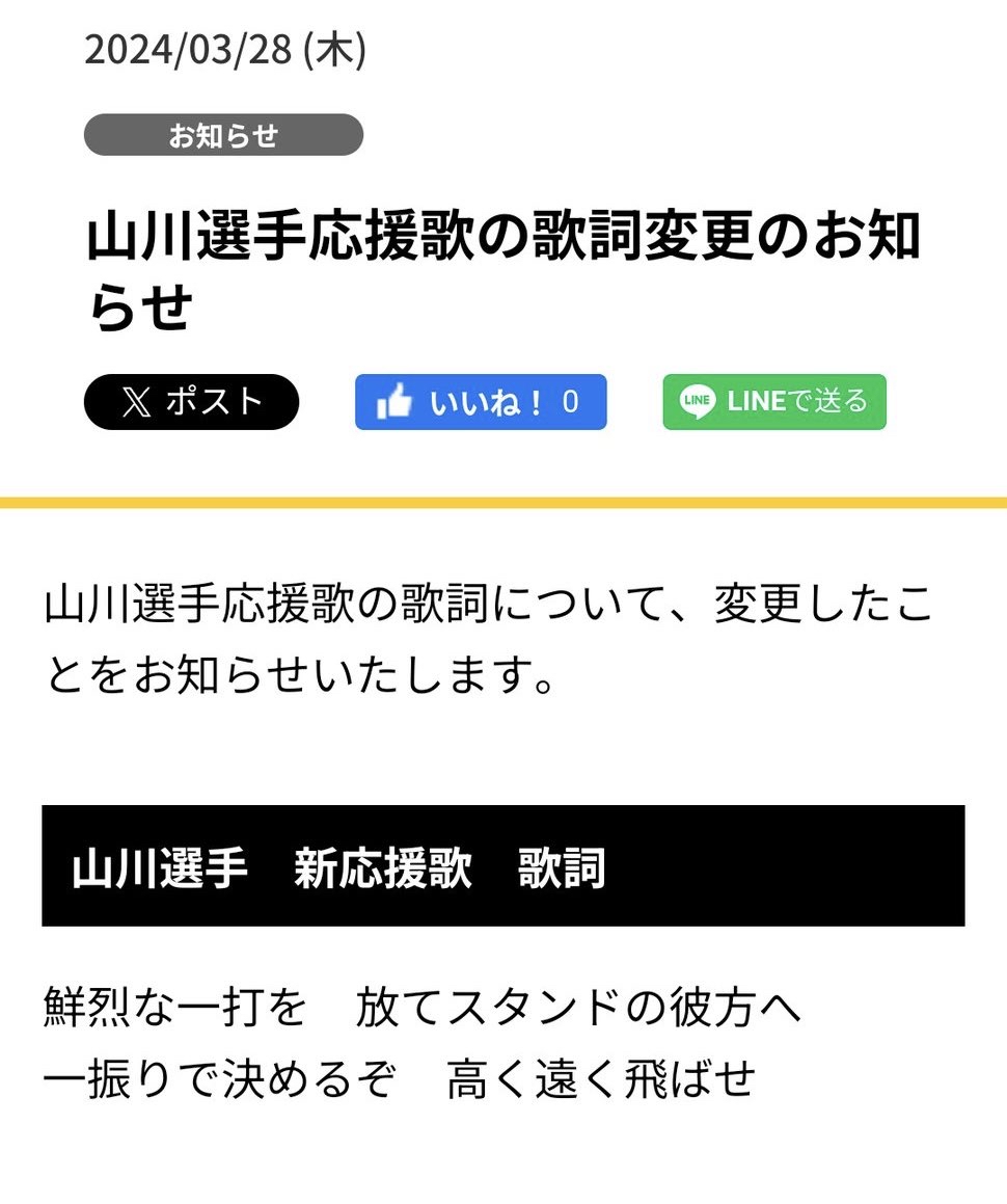 【画像】山川穂高の応援歌、歌詞変更されるwww