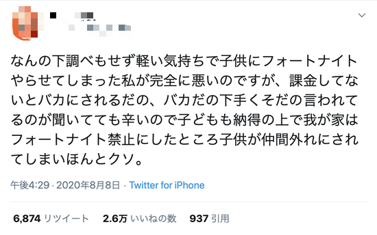 【画像】母親さん「子供にフォートナイトをやらせたら課金してないだの下手だのとバカにされた。クソが。」