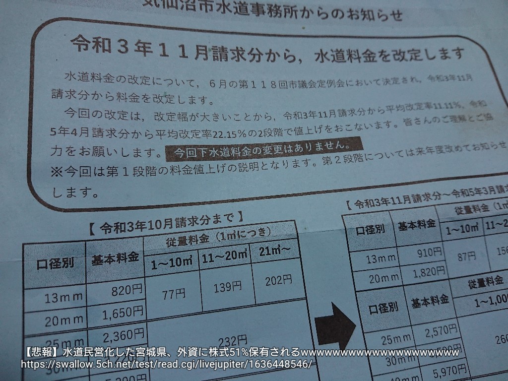 【画像】水道民営化された宮城県民さん、早速水道の値上げが始まり貧乏人は水を飲めなくなってしまう・・・