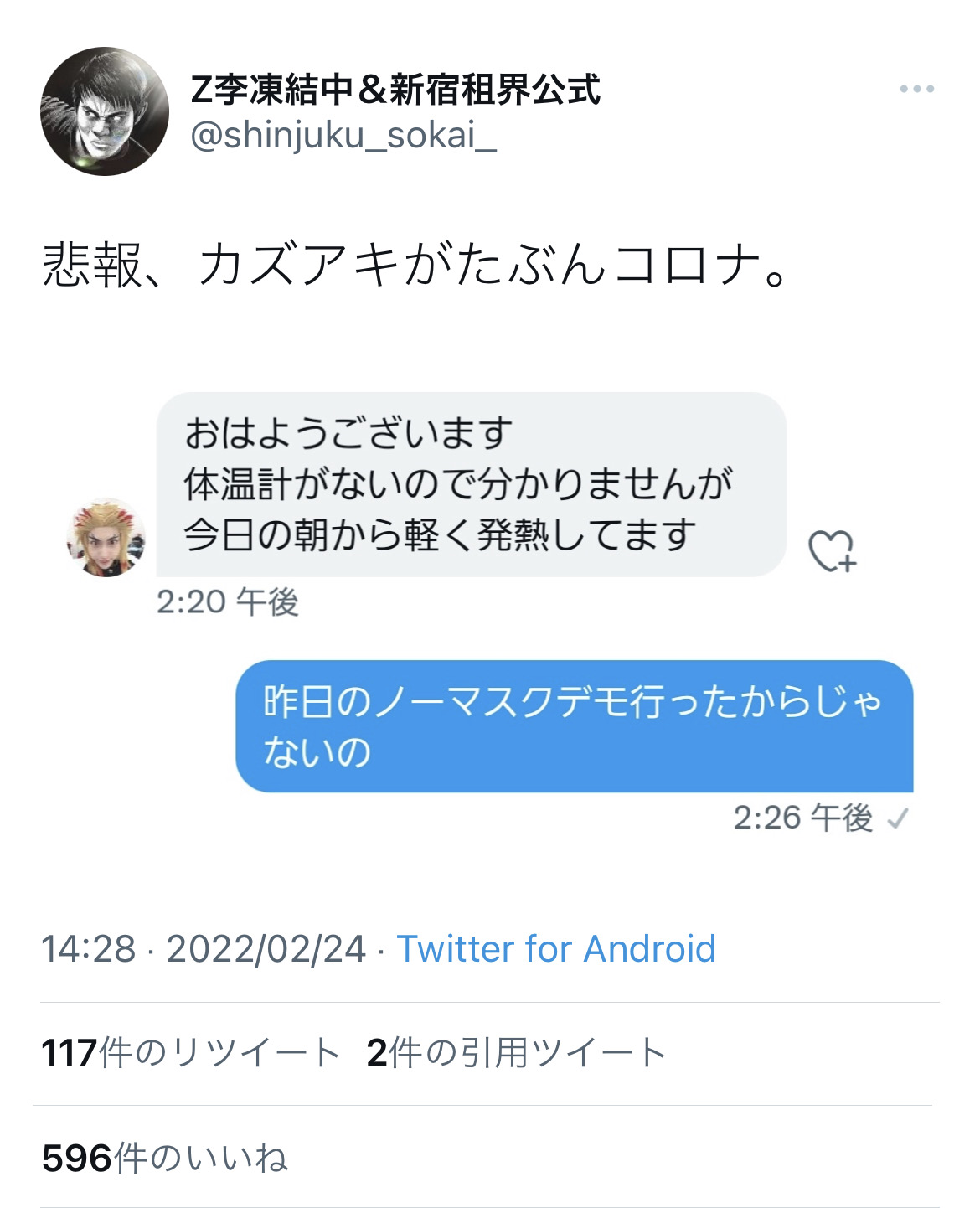 【画像】煉獄カズアキさん、コロナに感染したっぽいwwwwwww