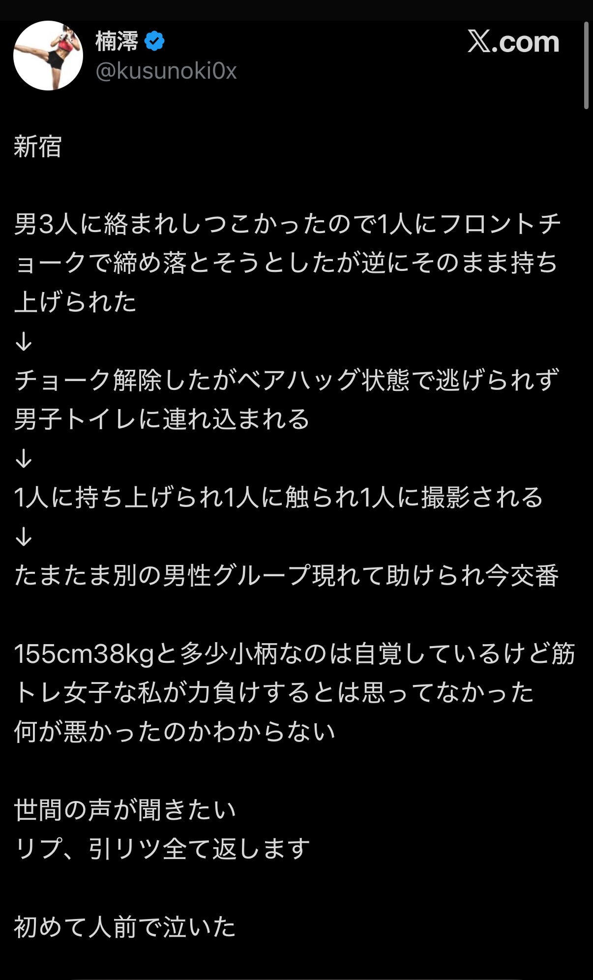 新宿男3人に絡まれしつこかったので1人にフロントチョークで締め落とそうとしたが逆にそのまま持ち上げられた↓チョーク解除したがベアハッグ状態で逃げられず男子トイレに連れ込まれる↓1人に持ち上げられ1人に触られ1人に撮影される↓たまたま別の男性グループ現れて助けられ今交番…