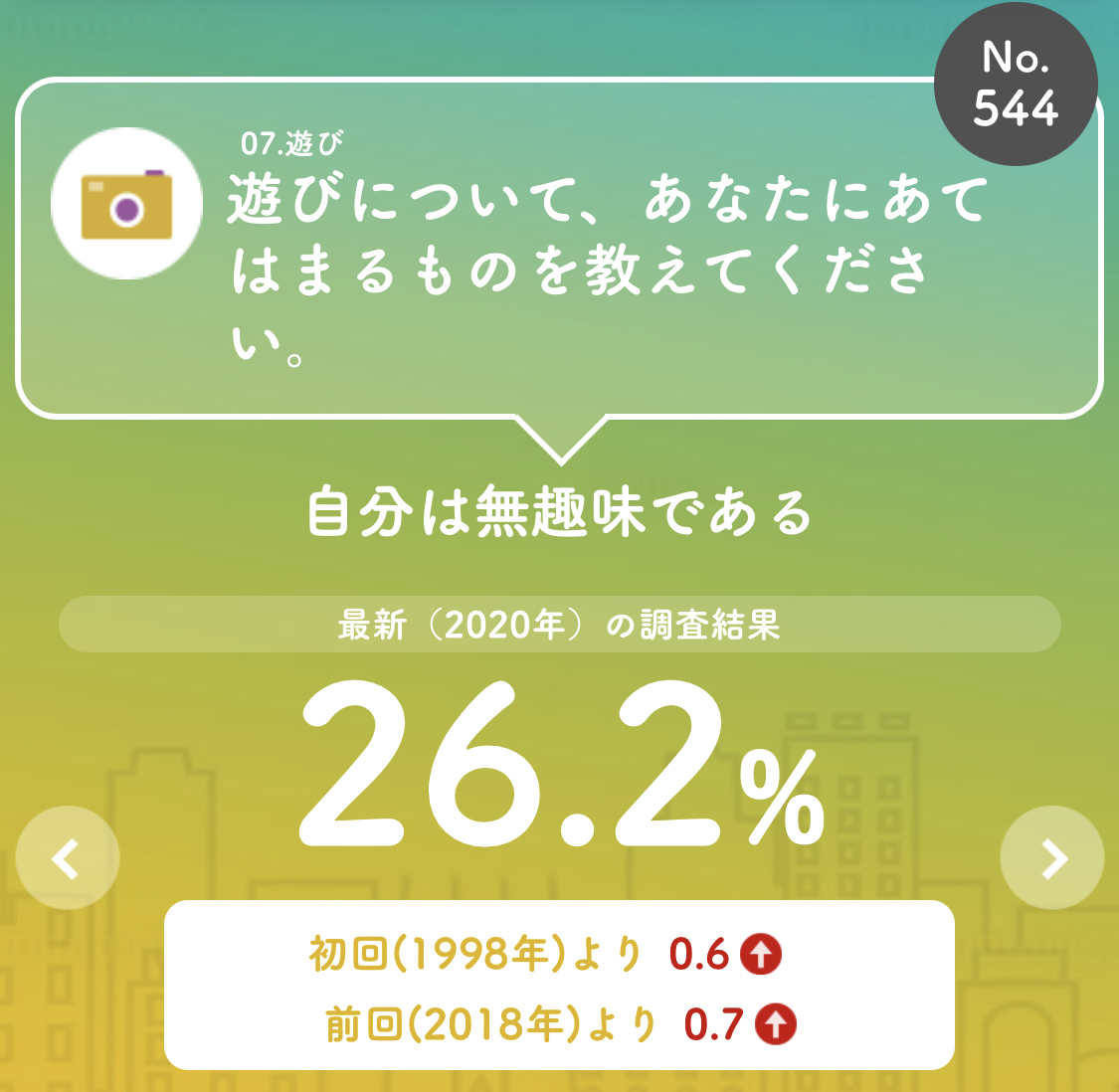 「自分は無趣味である」と答えた人の割合は、2020年は26.2%となりました。