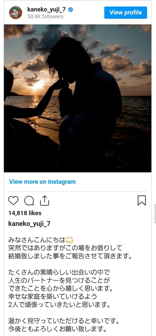 【画像】金子侑司の結婚報告インスタがロマンチック過ぎると話題にwww