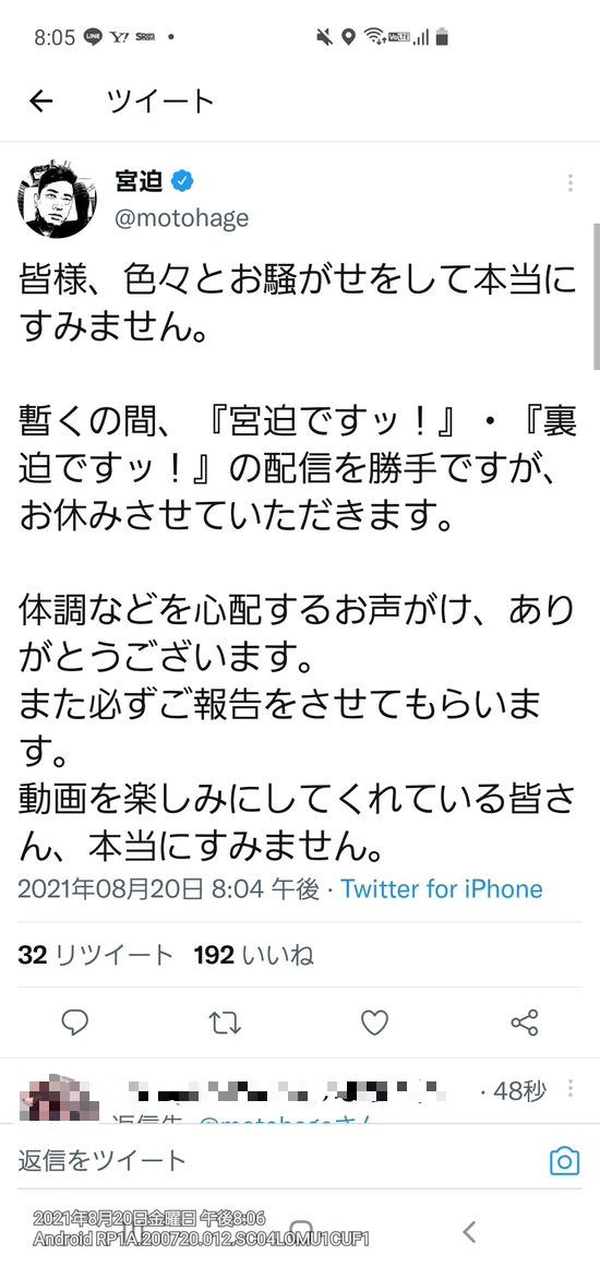 【画像】雨上がり宮迫さん「暫くの間、配信をお休みします」