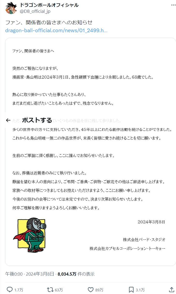 【画像】鳥山明の訃報に89万人がいいねしてしまう・・・