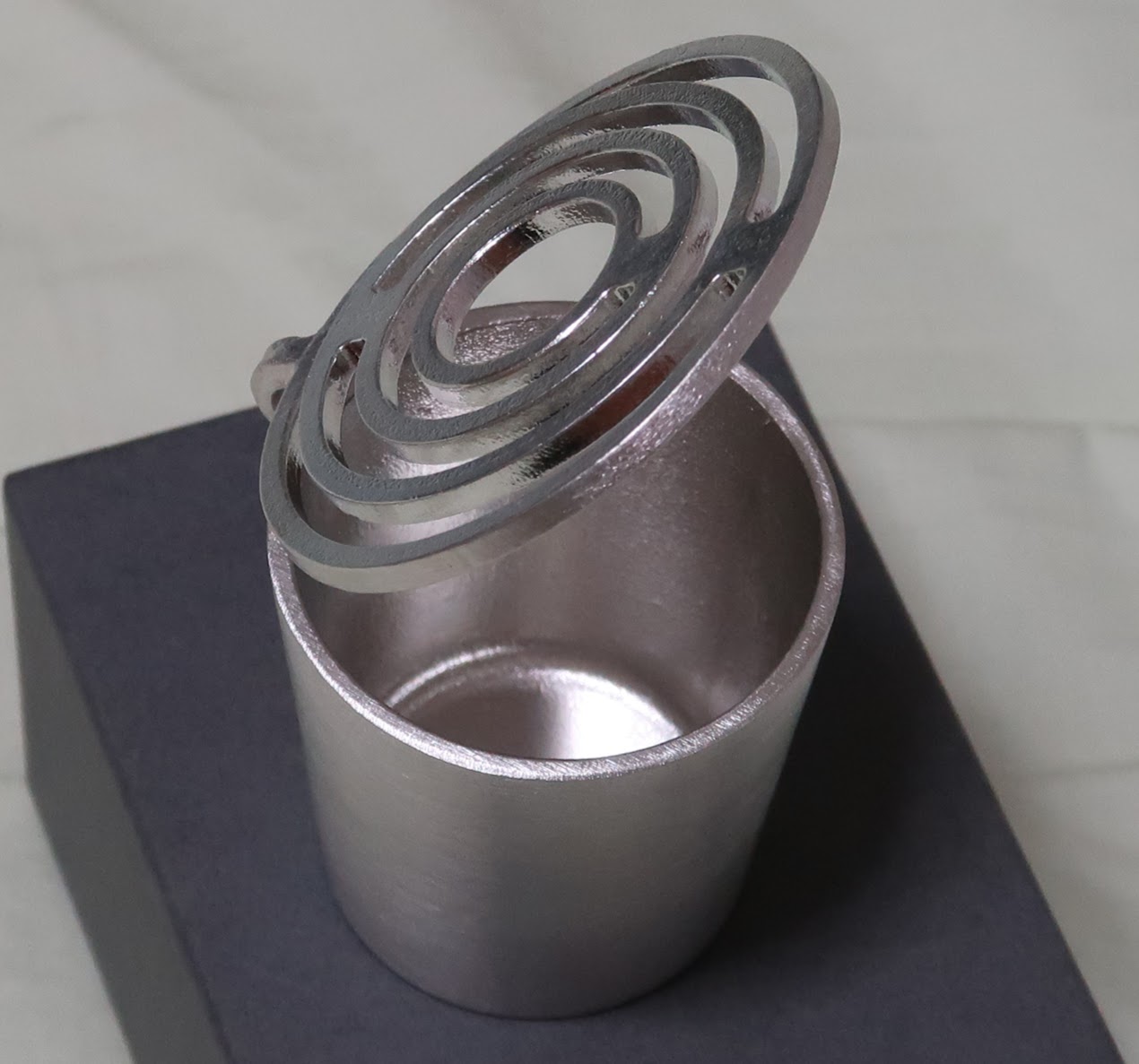 柔らかい金属で、幾重にも重なった丸の部分が自在に動かせる