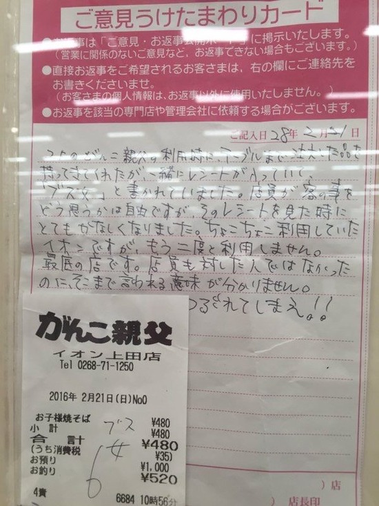 【画像あり】レシートに「ブス女」と書かれた主婦 怒りのクレームwww