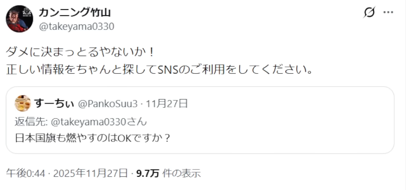 【画像あり】X民「日本国旗燃やすのはOKですか?」 カンニング竹山「ダメに決まっとるやないか!」