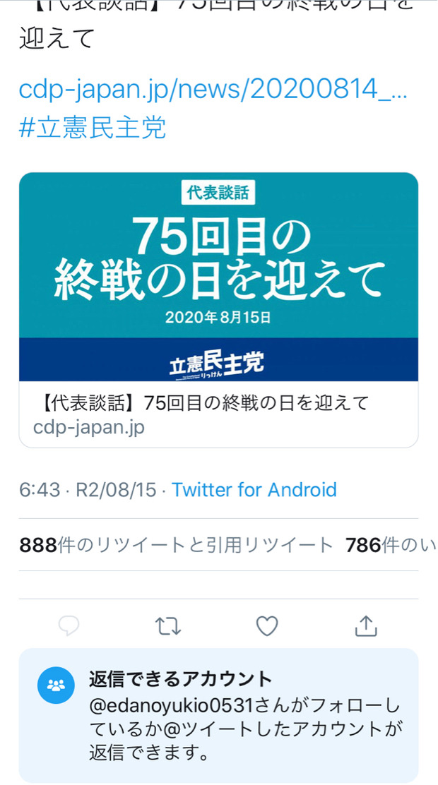 ↓返信できるアカウント@edanoyukio0531さんがフォローしているか@ツイートしたアカウントが返信できます。画像