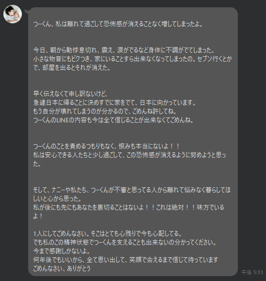 1 名前:名無しさん@おーぷん[] 投稿日:25/04/18(金) 08:06:04 ID:4nJmお久しぶりです、皆さま。今からとんでもないこと書きます。本当にごめんなさい。バッシング間違いなく頂きます。昨日れい、にな、みらんを連れて奥さんが画像の通り日本へ帰りました。
