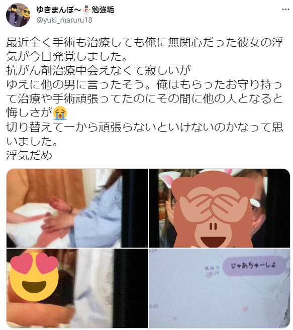 【胸糞注意】女さん、癌患者の彼氏が苦しんでいる中で浮気をぶちかましてしまう・・・・