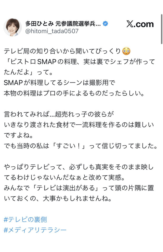 「SMAPの皆さんがすべて料理しているように見える演出についての問題提起が目的でした」 9月12日、国民民主党・兵庫県参議院支部長の多田ひとみ氏がSNS上で投稿した“問題提起”が大きな物議を醸している。フジテレビの人気番組『SMAP×SMAP』内のコーナー「ビストロSMAP」について、料理の裏側を暴露するような内容を投稿したところ、SMAPファンを中心に激しい批判を浴び、投稿を削除して謝罪する事態に発展した─。(省略)全文