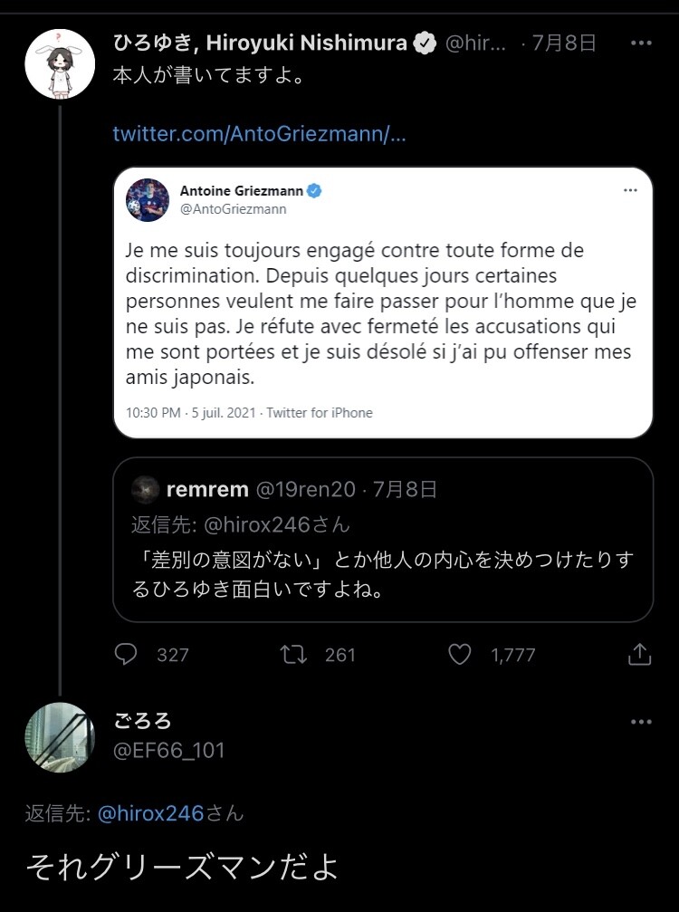 論破というか外国語の名前すら読めなくなってしまった模様ひろゆき「デンベレの発言に差別意図はない」↓一般人「何でデンベレの内心を決め付けてるの?」↓ひろゆき「本人がそう言ってる(何故か愛想笑いしてただけのグリーズマンの謝罪文を引用)」↓一般人「それグリーズマンだよ」