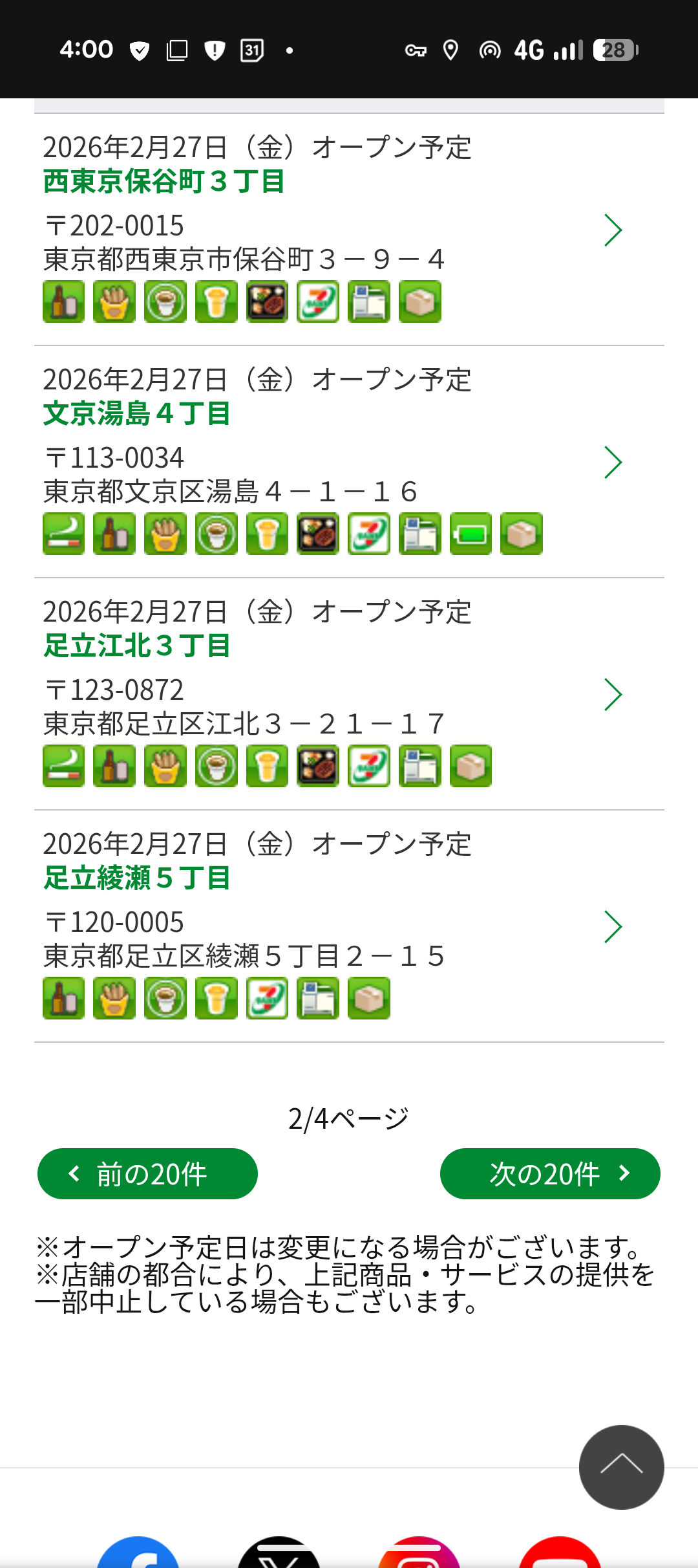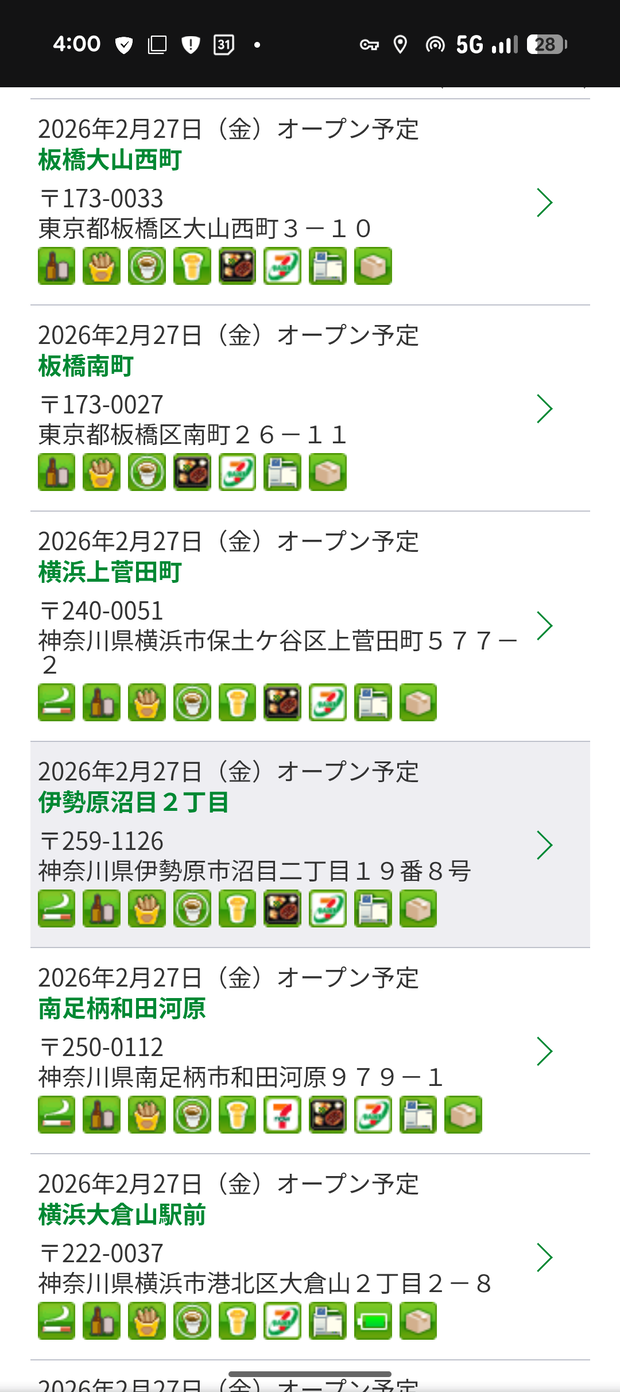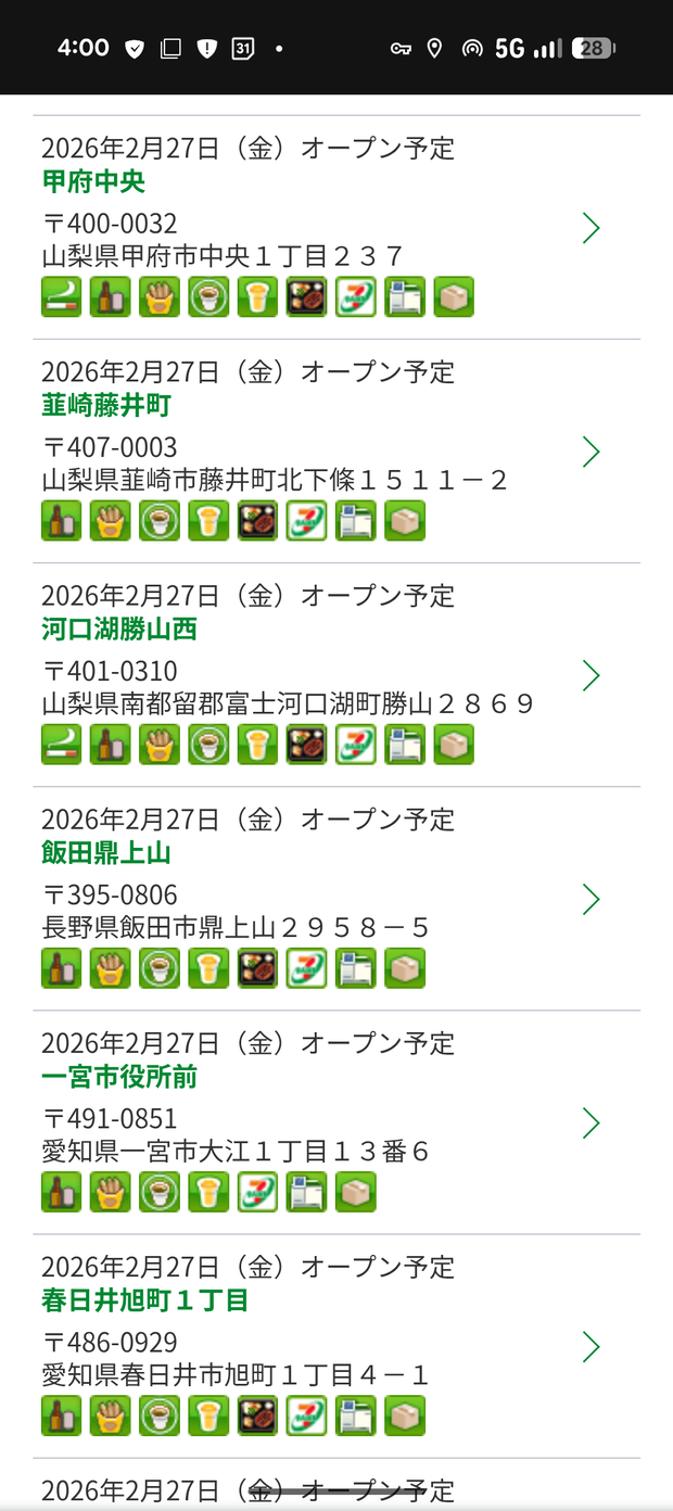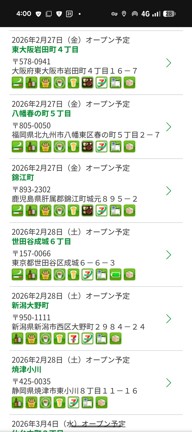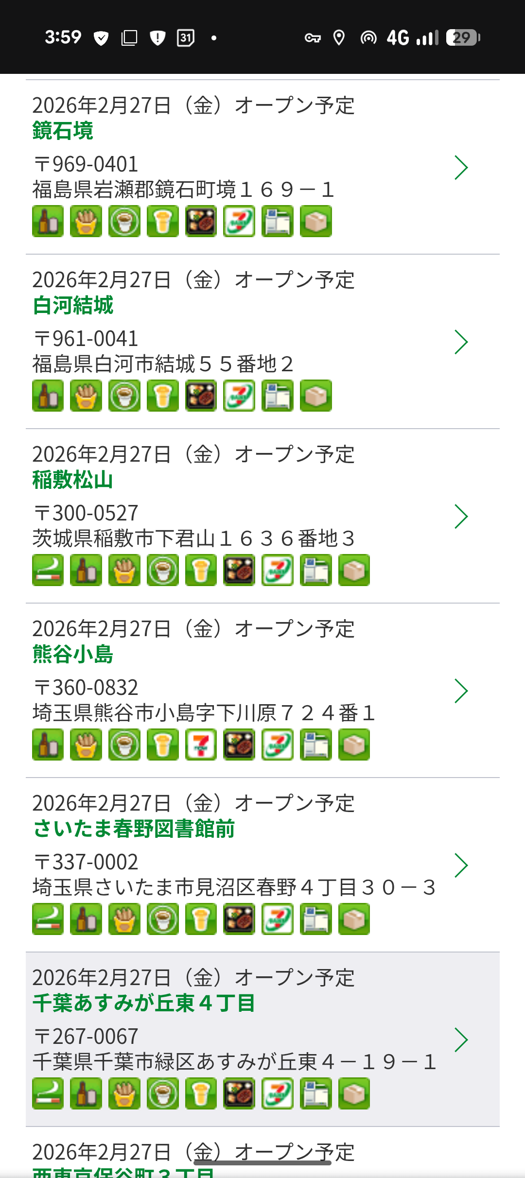 1:2026/02/27(金) 05:01:10.94 ID:36Z5eQrt0新規オープン予定店舗一覧|店舗検索|セブン‐イレブンhttps://seven-eleven.areamarker.com/711map/shoplist/coming-soon