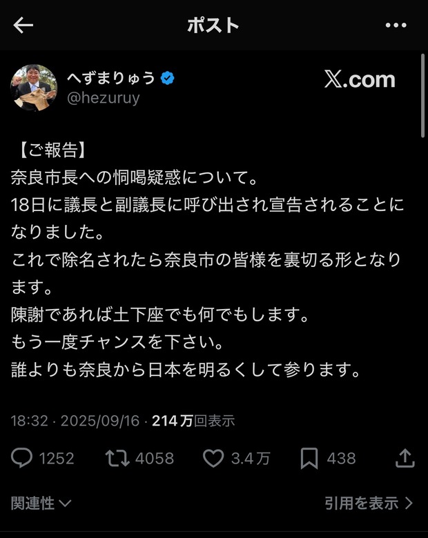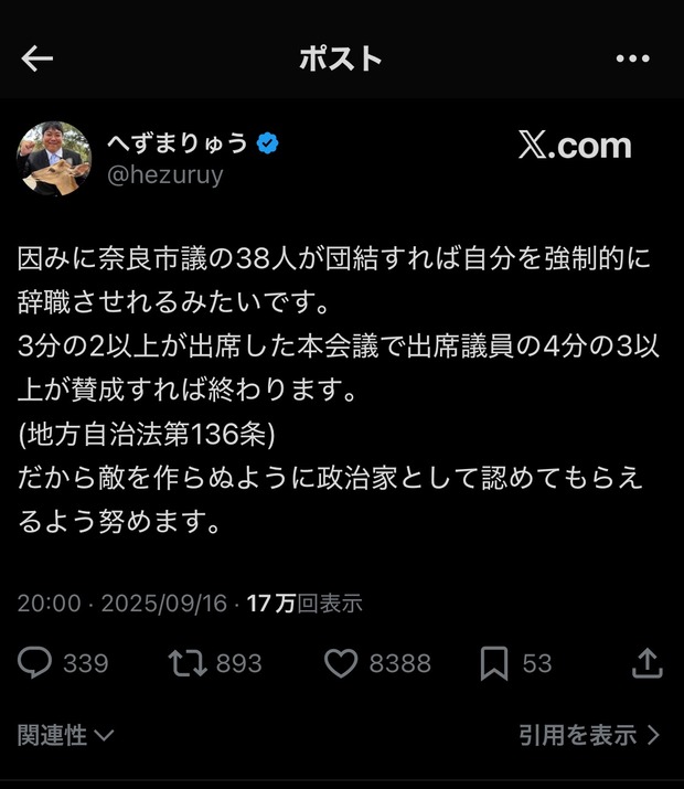 【速報】へずまりゅうガチで逝きそう 奈良市議38人の賛同を得れば除名へ