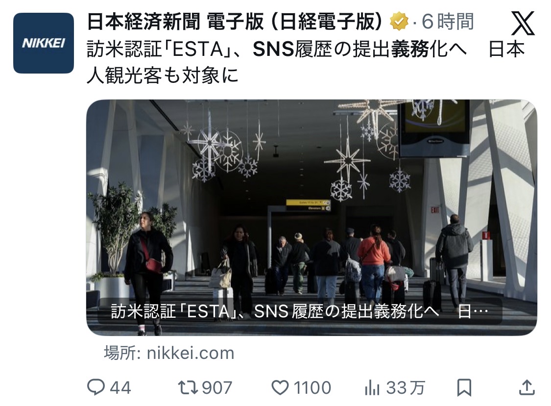 訪米認証「ESTA」、SNS履歴の提出義務化へ 日本人観光客も対象にhttps://t.co/bqyhm0BkAG— 日本経済新聞 電子版(日経電子版) (@nikkei) December 10, 2025転載元スレッド:https://viper.2ch.sc/test/read.cgi/news4vip/1765420849/