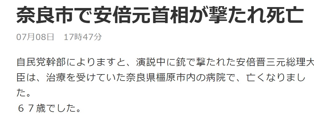 67歳でした。奈良市で安倍元首相が撃たれ死亡