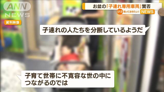 お盆休み「子連れ専用車両」賛否…分断につながる?https://news.yahoo.co.jp/articles/4fbc08100b1acb798f6d3a5a670b7efcacf6cb5d小田急電鉄では今年の春から、一部の車両に「子育て応援車」を導入。誰でも乗ることができますが、子連れの方が安心できるように見守りましょう、と呼び掛けています。また、都営地下鉄・大江戸線は2019年から、一部の車両に「子育て応援スペース」を設置しています。ただ、こうした“専用車両”が作られることに、SNS上では「子連れの人たちを分断しているようだ」といった疑問の声や、「子育て世帯に不寛容な世の中につながるのでは」といった懸念の声も上がっています。続きを読む
