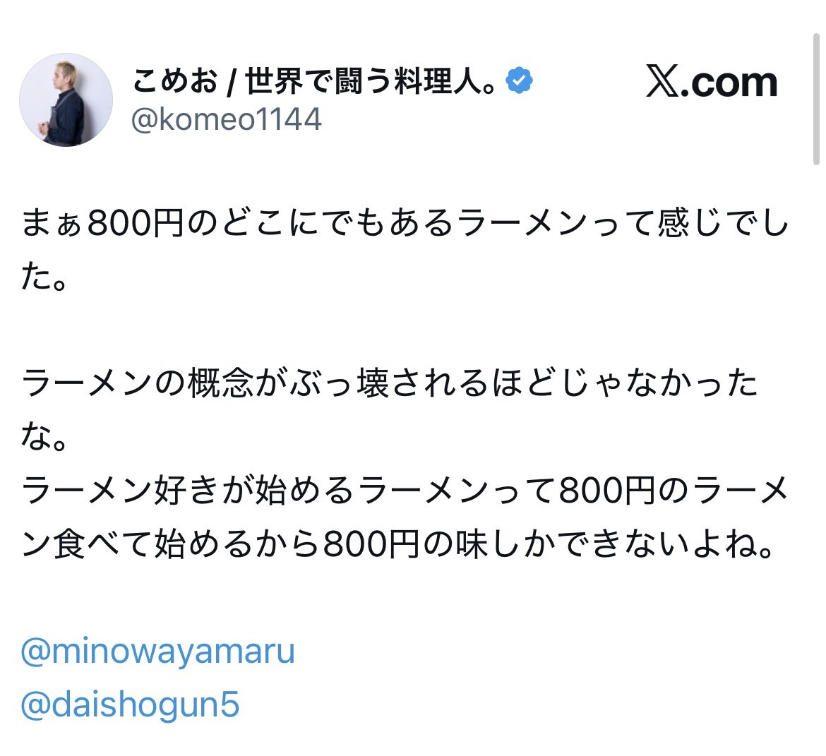 こめお「ラーメン好きが始めるラーメン屋は800円の味しか出来ない」