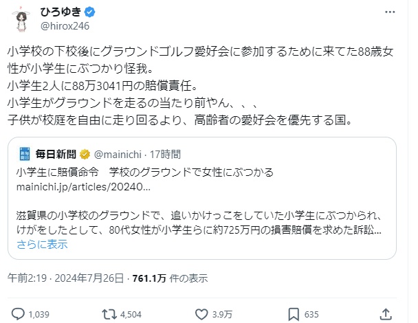小学校の下校後にグラウンドゴルフ愛好会に参加するために来てた88歳女性が小学生にぶつかり怪我。小学生2人に88万3041円の賠償責任。小学生がグラウンドを走るの当たり前やん、、、子供が校庭を自由に走り回るより、高齢者の愛好会を優先する国。 https://t.co/hefXz2sMKJ— ひろゆき (@hirox246) July 25, 2024転載元スレッド:https://hayabusa3.2ch.sc/test/read.cgi/news/1721971031/続きを読む