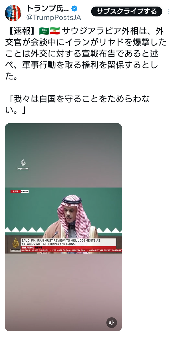 【速報】🇸🇦🇮🇷 サウジアラビア外相は、外交官が会談中にイランがリヤドを爆撃したことは外交に対する宣戦布告であると述べ、軍事行動を取る権利を留保するとした。「我々は自国を守ることをためらわない。」