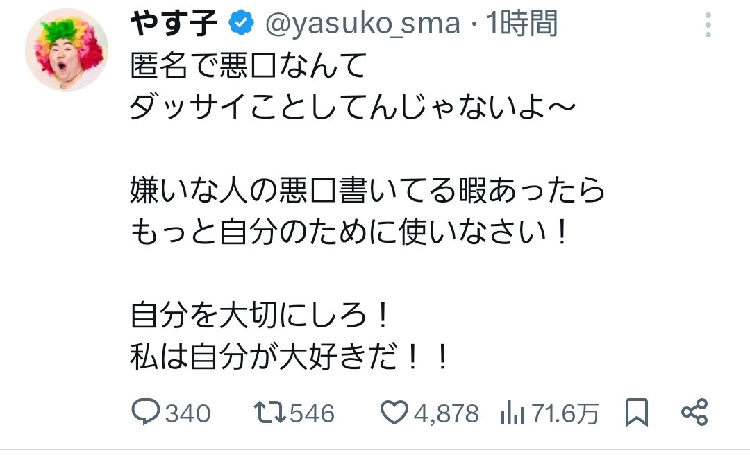 匿名で悪口なんてダッサイことしてんじゃないよ~嫌いな人の悪口書いてる暇あったらもっと自分のために使いなさい!自分を大切にしろ!私は自分が大好きだ!!— やす子 (@yasuko_sma)