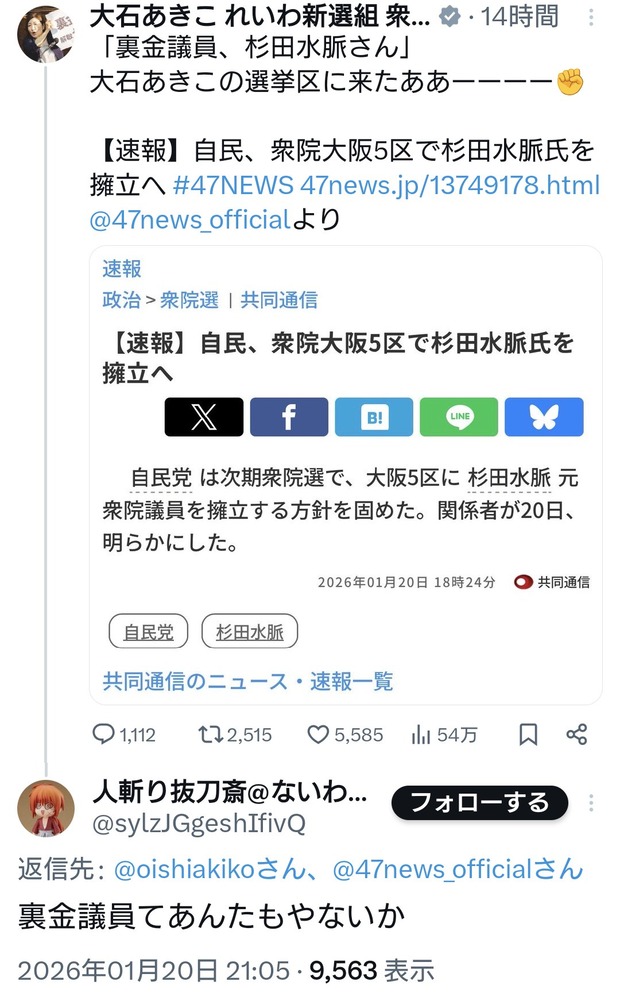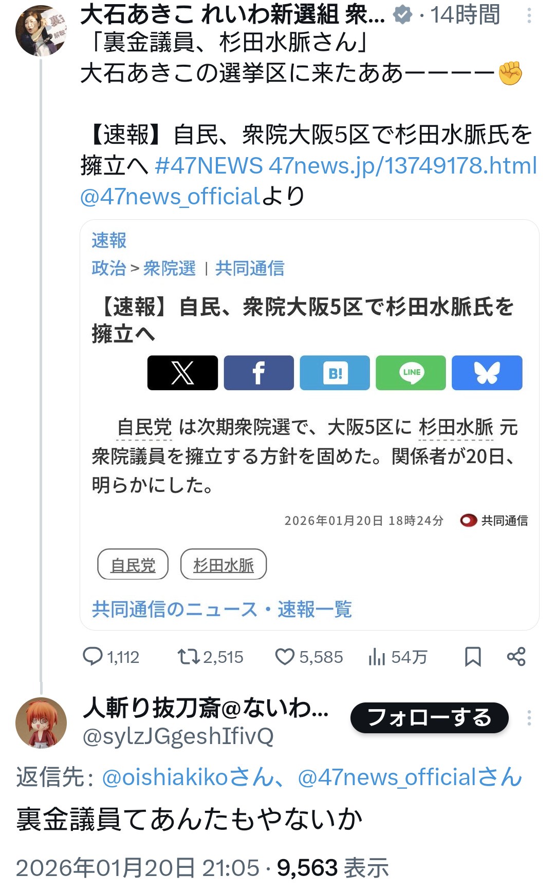 そういうあなたも、1280万円の裏金議員じゃんw https://t.co/liV7BOV9yn— いなり王子・坂梨カズ (@inari_oji) January 20, 2026転載元スレッド:https://hayabusa3.2ch.sc/test/read.cgi/news/1768960191/