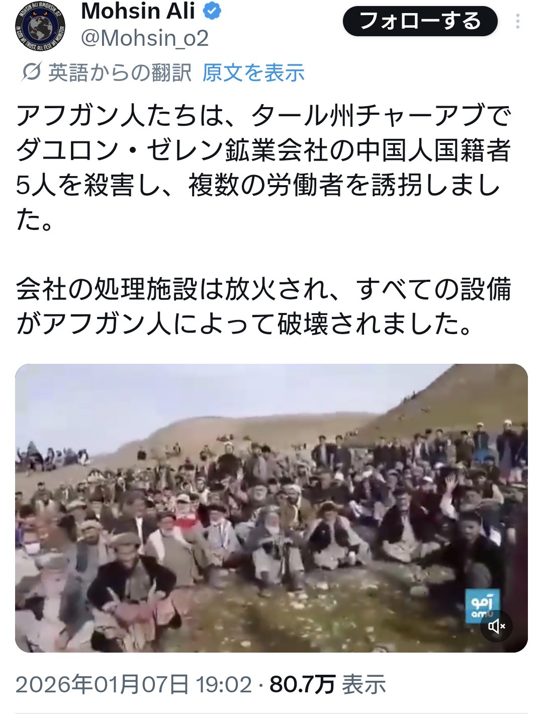 1:2026/01/08(木) 16:27:06.57 ID:FHpHFQcT0アフガニスタンで現地の人々が中国のレアアース採掘精錬施設を破壊、中国人5名を殺害 https://t.co/IY0vMBeRcl— Cafe_Forex(テムズ川の流れ) (@UponTheThames) January 8, 2026