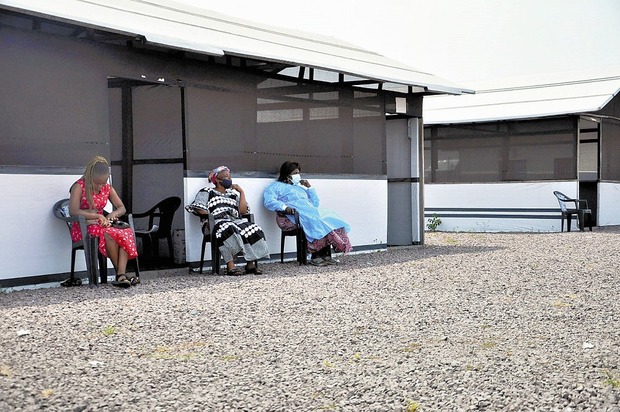 首都キンシャサのワクチン接種会場で、ひたすらイスに腰掛けたまま接種希望者が来るのを待つ看護師ら(8月23日)