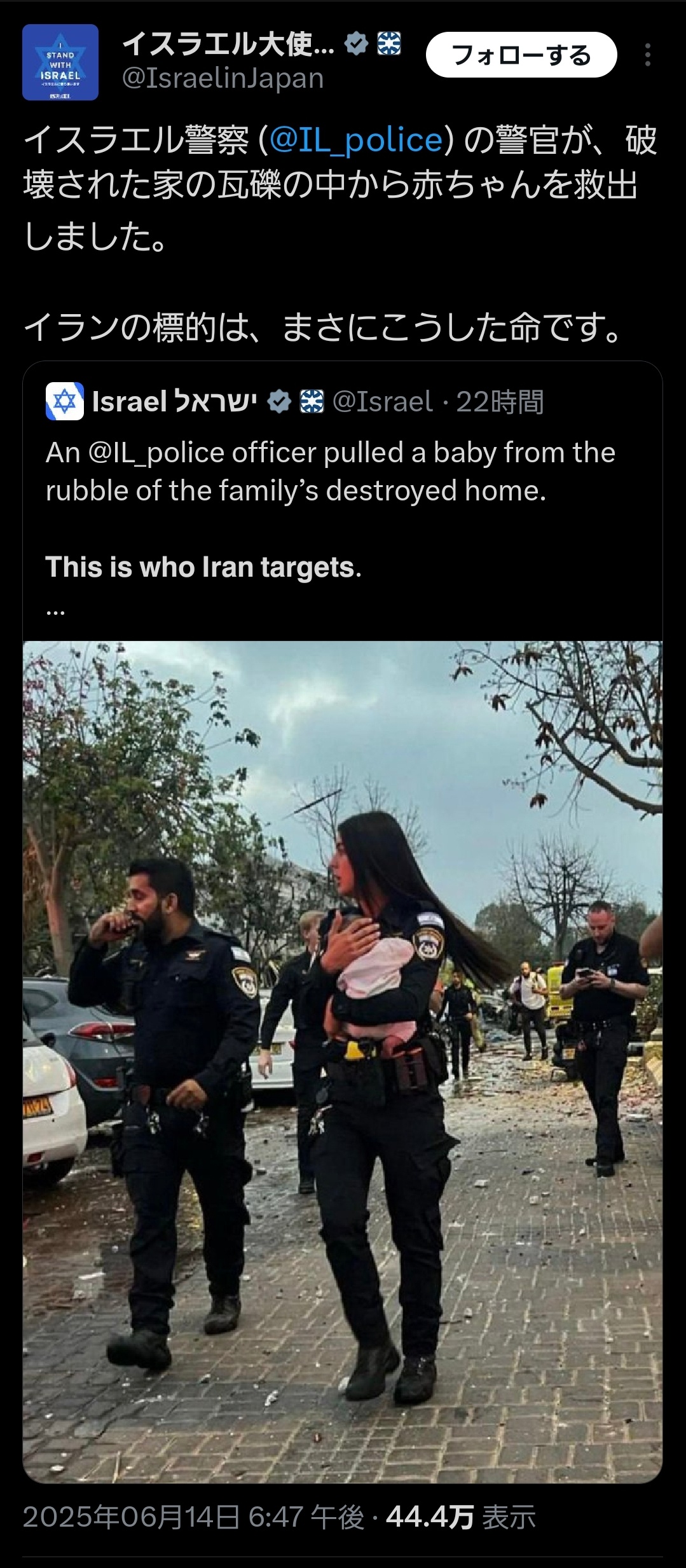 イスラエル大使館「我が警察が瓦礫の中から赤ちゃんを救出。イランの標的はまさにこうした命です」