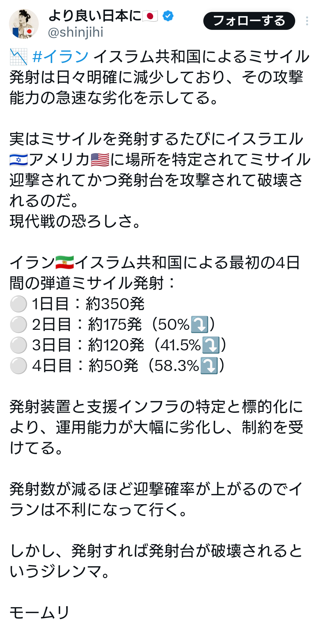 1:2026/03/04(水) 15:05:08.73 ID:uSKrmSQa0📉 #イラン イスラム共和国によるミサイル発射は日々明確に減少しており、その攻撃能力の急速な劣化を示してる。実はミサイルを発射するたびにイスラエル🇮🇱アメリカ🇺🇸に場所を特定されてミサイル迎撃されてかつ発射台を攻撃されて破壊されるのだ。現代戦の恐ろしさ。… https://t.co/qgSSRG9Txn pic.twitter.com/S8p7tdEUDC— より良い日本に🇯🇵 (@shinjihi) March 4, 2026