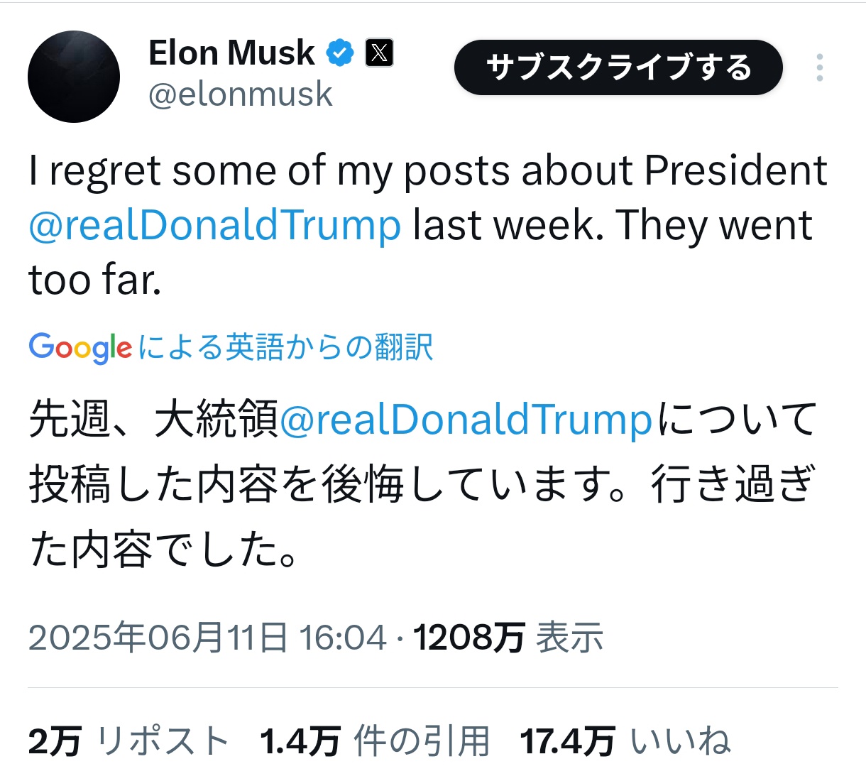 I regret some of my posts about President @realDonaldTrump last week. They went too far.— Elon Musk (@elonmusk) June 11, 20252 : 以下、?ちゃんねるからVIPがお送りします :2025/06/11(水) 19:09:46.892 ID:uUC7bi7i0.netだっさw3 : 以下、?ちゃんねるからVIPがお送りします :2025/06/11(水) 19:09:58.857 ID:JlI+dyWL0.net仲直りできてよかったね🥲4 : 以下、?ちゃんねるからVIPがお送りします :2025/06/11(水) 19:10:51.382 ID:scGA5+n2d.netだっせぇ5 : 以下、?ちゃんねるからVIPがお送りします :2025/06/11(水) 19:10:54.822 ID:LbaYYmKF0.netイキリ陰キャの代表格だな転載元スレッド:https://viper.2ch.sc/test/read.cgi/news4vip/1749636553/
