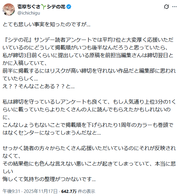 とても悲しい事実を知ったのですが…『シテの花』サンデー読者アンケートでは平均7位と大変厚く応援いただいているのにどうして掲載順がいつも後半なんだろうと思っていたら、私が締切3日前くらいに提出している原稿を前担当編集さんは締切翌日とかに入稿していて、…— 壱原ちぐさ??シテの花 (@ichichigu) November 17, 2025 暴露後web送り週刊少年サンデー『シテの花』連載をサンデーうぇぶりに移籍。執筆や取材のスケジュールをより円滑にするため2 名前:名無しさん@おーぷん[] 投稿日:25/11/18(火) 09:54:04 ID:Rsd8まーたサンデー編集部がやらかしたんか3 名前:名無しさん@おーぷん[] 投稿日:25/11/18(火) 09:54:22 ID:td37ようわからんけどたいへんやね4 名前:名無しさん@おーぷん[] 投稿日:25/11/18(火) 09:54:43 ID:vuiA読者アンケートで平均7位は微妙なのでは?続きを読む
