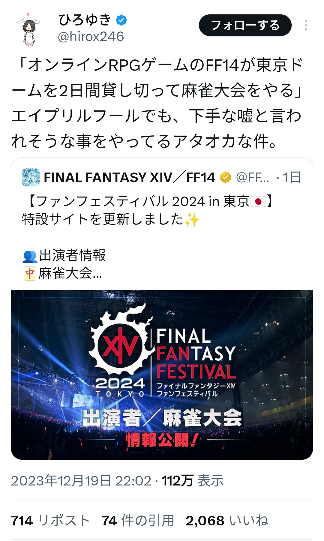 東京ドームでFF14の麻雀大会2日かけてやるのはアタオカだってさ2 名前:名無しさん@おーぷん[] 投稿日:23/12/21(木) 11:25:30 ID:XHqBゲーム作るよりは有意義やろ多分3 名前:名無しさん@おーぷん[] 投稿日:23/12/21(木) 11:25:34 ID:7PLK幕張メッセならばギリ許されてた感じ?4 名前:名無しさん@おーぷん[] 投稿日:23/12/21(木) 11:25:45 ID:OO4nなんで麻雀?6 名前:名無しさん@おーぷん[] 投稿日:23/12/21(木) 11:26:08 ID:Yt72ついにというか元から弱ったものしか叩かんやろ10 名前:名無しさん@おーぷん[] 投稿日:23/12/21(木) 11:27:24 ID:XHqB>>6ついにひろゆきにも叩かれるほど弱ってしまったんや続きを読む