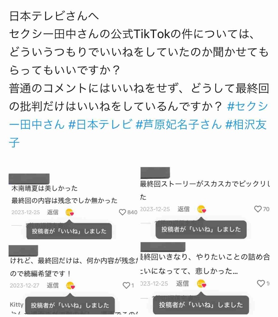 公式tiktok垢が今回亡くなった原作者が脚本した回の不満に対するコメントにいいねをつけている、なお普通のコメントにはいいねしていない模様2 名前:名無しさん@おーぷん[] 投稿日:24/01/30(火) 20:57:46 ID:CzEwガッカリやわ、こんな露骨にやってたんか3 名前:名無しさん@おーぷん[] 投稿日:24/01/30(火) 20:57:50 ID:abXe公式で原作者いじめしてんのは普通に引くわ6 名前:名無しさん@おーぷん[] 投稿日:24/01/30(火) 21:00:28 ID:VcRZ公式がこんなことを?7 名前:名無しさん@おーぷん[] 投稿日:24/01/30(火) 21:00:59 ID:abXe>>6公式アカウントでしてたらしいでtiktokかなんかで続きを読む