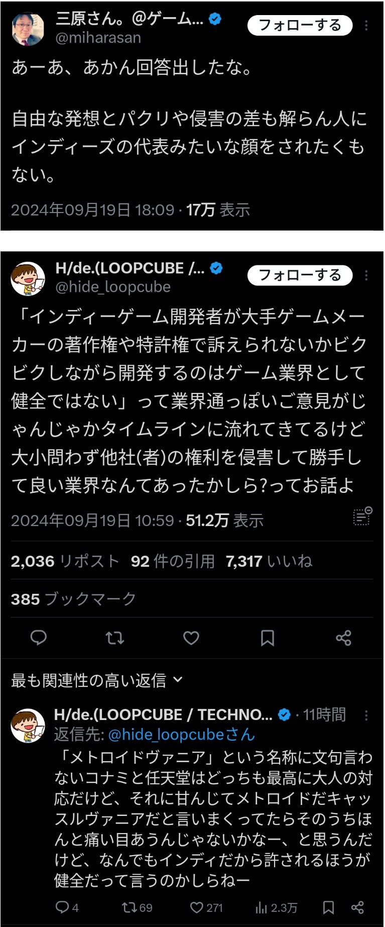 1 名前:名無しさん@おーぷん[] 投稿日:24/09/20(金) 11:09:27 ID:OqvL任天堂に特許侵害で訴訟されたとして当社に対する訴訟の提起について本日、当社に対して特許権の侵害に関する訴訟を提起した旨の発表が、任天堂株式会社及び株式会社ポケモンより行われました。…— パルワールド/Palworld 公式 (@Palworld_JP) September 19, 2024 「インディーゲーム開発者が自由な発想を妨げられ萎縮することがないよう~」と勝手にインディーズ代表ヅラして被害者アピールしたもんだから…株式会社ARIKA副社長:三原(ゲーム開発下請け大手)ループキューブ:H/de(ゲームBGM専門会社)