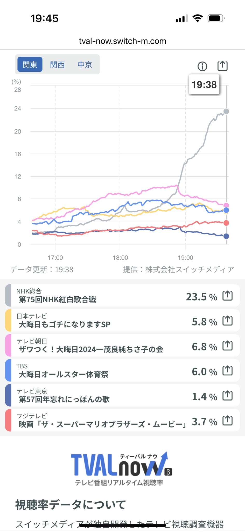 あんなにわからない曲ばかりなのに紅白強いな、、、日テレはガキ使ないのがやはり痛いな。テレ東はやはり歌謡曲でも紅白に勝てないのね。フジテレビは視聴率上げるならちびまる子、サザエさん、ワンピースあたりを大晦日で組めば間違いなく2位か3位にはつけれそうだよ。正直テレ朝の強さが不明?? pic.twitter.com/rYpwUTgUk7— ??????玉川なおき????@好きしか勝たん?? (@kizuna_radio795) December 31, 2024 2 名前:あけおめ@吉[] 投稿日:25/01/01(水) 11:18:27 ID:nIXuちさ子強すぎ