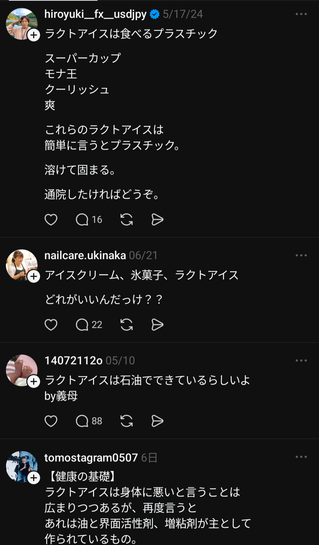 知らずに食べてる人が多いですが「ラクトアイス」はアイススクリームじゃありません。食べるなら「種類別:アイスクリーム」乳脂肪8%以上原料が「生乳・卵・砂糖」だけのやつこれが本物のアイスクリームです。pic.twitter.com/1VEjlGGTX3— なお@食の安全について追及します。 (@hikegami3) December 1, 2025転載元スレッド:https://viper.2ch.sc/test/read.cgi/news4vip/1765540340/